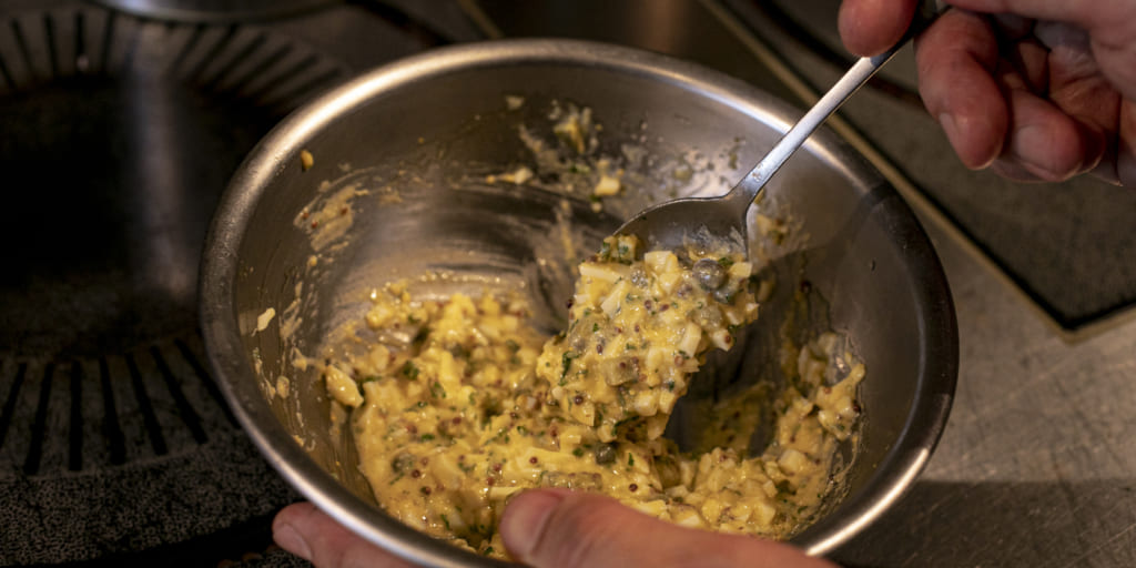 グリビッシュソースを作る。茹で卵を黄身と白身に分け、黄身にオイルを加えながら混ぜて乳化させ、刻んだ白身、ケイパー、チャービルを加えてよく混ぜる。