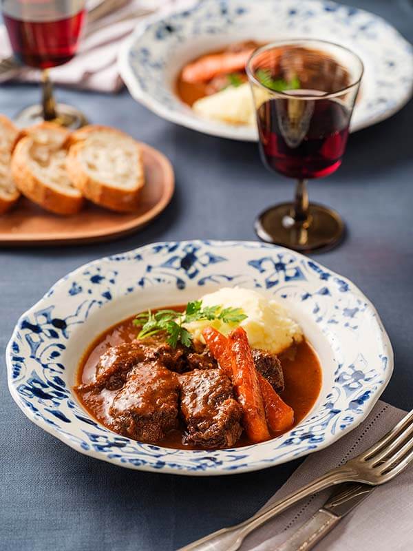 「時間はかかりますが、プロセス自体は難しくなくて、手間ヒマかけたようなおもてなし感が出る牛肉の赤ワイン煮込みです。玉ねぎを炒めるところで水は使いますが、それ以外の水分は全部赤ワイン。ワイン一本丸々使っているので、奥行きのあるコクが出ます。ワインは、香りが華やかで繊細な味わいのブルゴーニュの赤がおすすめですが、ない場合は飲んだ時に好みの味のワインを。もし、ワインの酸味が強いときは、砂糖を少量足すとまろやかになります。牛肉のだしや玉ねぎの旨味との相乗効果で、コンソメなどの調味料は必要ないので、素材の美味しさを堪能していただけると思います」