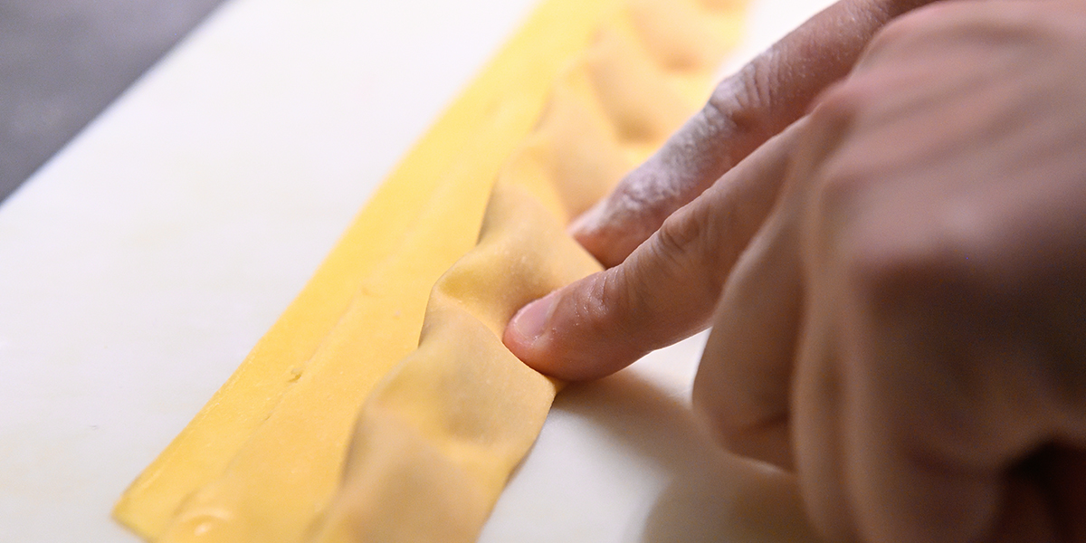余分な生地をカッターで切り落とし、フィリングとフィリングの間をカッターで等間隔に切る。最後の切り分け時には、生地の端をつまんでしっかり閉じる。