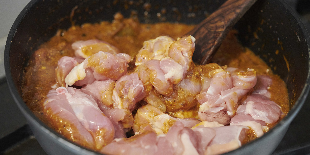 ポーク、ビーフと比べて、失敗が少ないというチキンカレー。鶏肉は長く煮込みすぎないのが水野さん流で、具材として最後に加え、全体的に白っぽくなって表面にほんのり焼き色がついたら、水を加えて煮込みましょう。