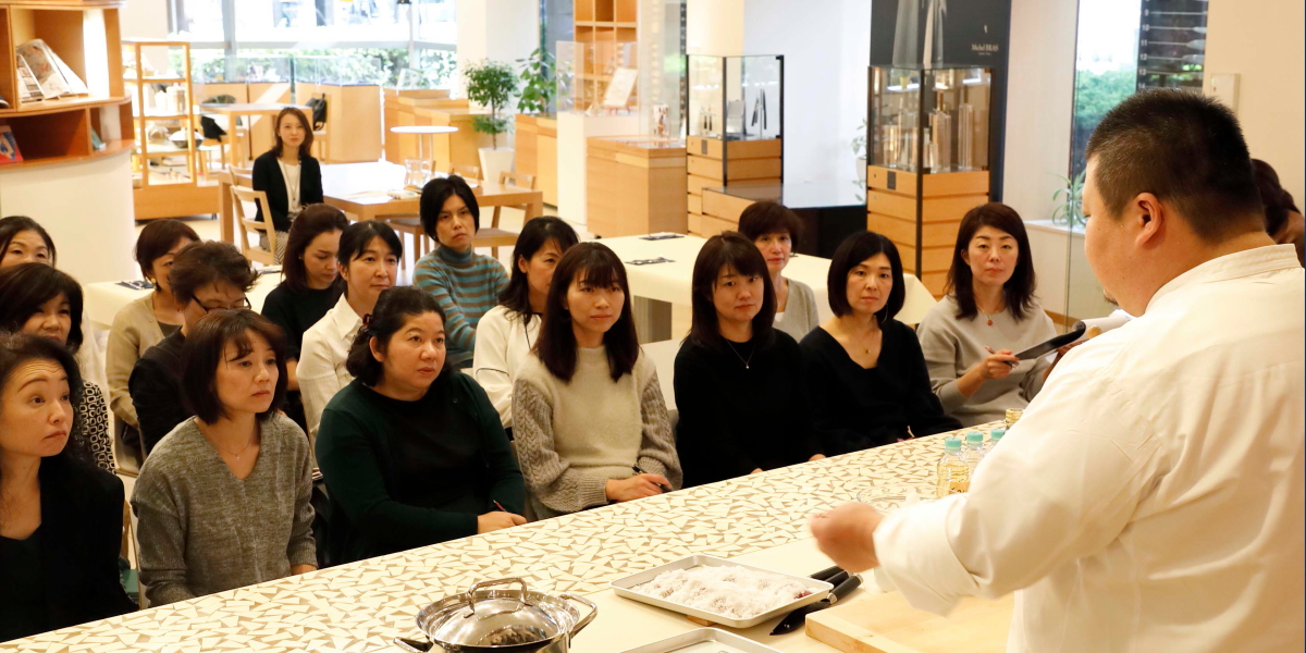 今回特に「コハダと鯖のマリネ」の酢で魚をしめる手順について江戸前ずしで学んだ方法を惜しみなく紹介してくれました。例えば青魚の下処理をする際、流水で洗うという人が多いなか、「水ではなく、塩水で洗う」方法を伝授。もともと海にいた生き物のため塩水で洗えば鮮度が変わるという理由に参加者も何度もうなずき、納得の様子。